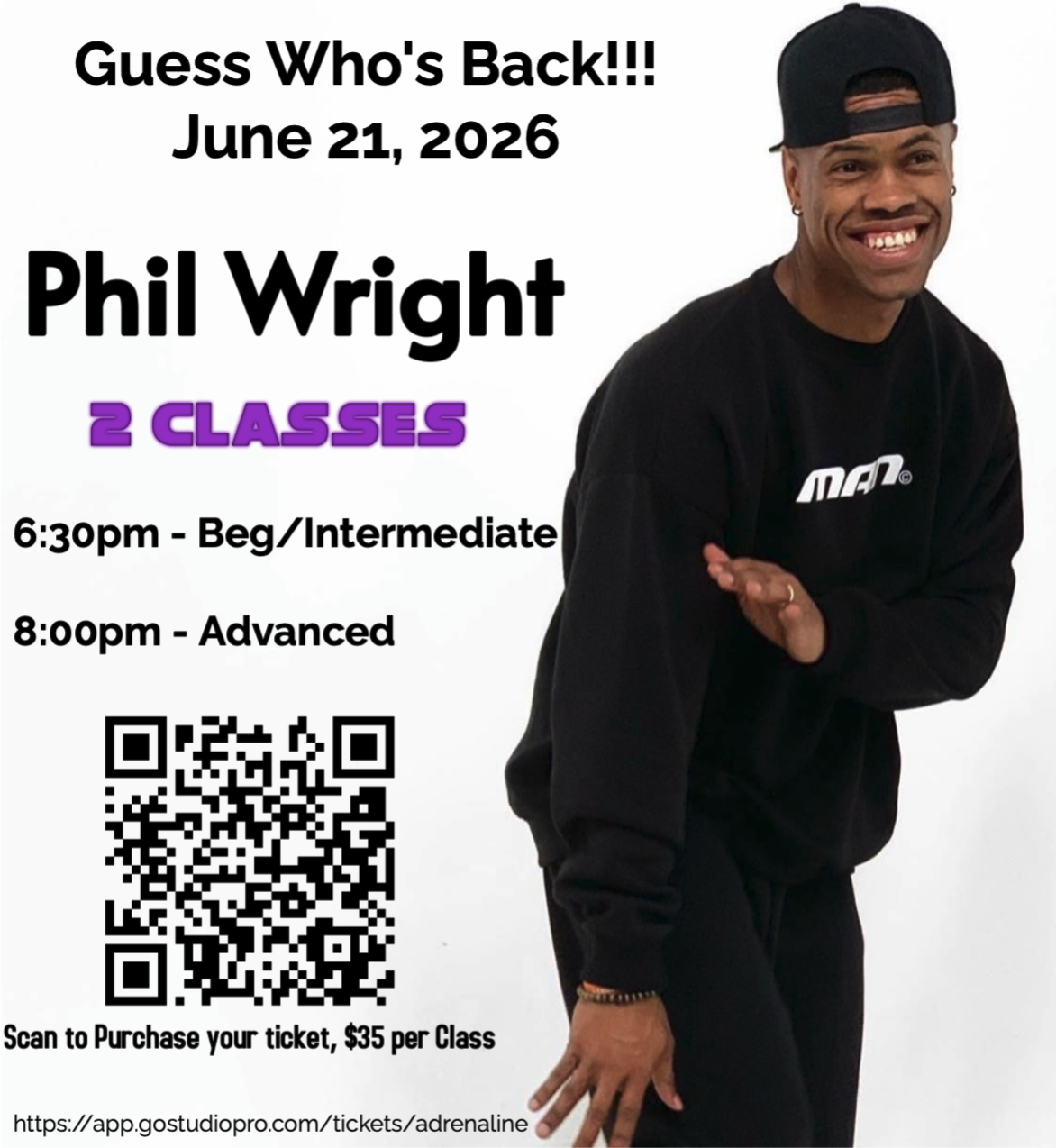 World-renowned dancer and choreographer, Phil Wright is coming to teach two Master Classes on June 21st at Adrenaline Studio!